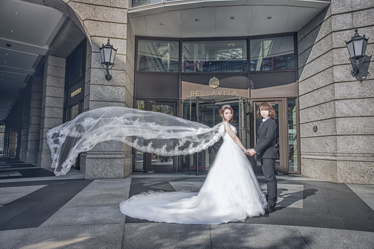 這件主要是拿來婚紗外拍使用,肩紗的感覺蠻特別,不像頭紗沉重也沒有大拖尾的不方便,CP值超高,所以就算外拍弄髒也不心疼。上面的珠鑽蕾絲都很細緻,當初朋友幫我一起開箱時,除了覺得好看之外還驚呼「好新啊!」我是沒啥感覺想說買的當然是新的,但聽說如果是租借的外拍禮服,都有很多修改過的線頭留在上面。這件外拍後我就馬上送洗,回來還是白帥帥,加上賣家貼心贈送收藏袋,所以保存好好的。婚紗在收納時,要反過來收,把紗多的正面收起來,洗衣店說很多人不知道要這樣收,所以看到我們有收好很驚訝,還說他們清洗時也是這樣反過來洗。(我們開箱時看到的禮服就是反過來折疊所以知道)